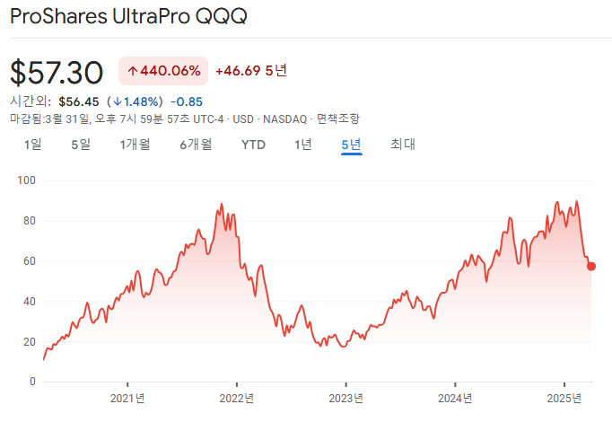 주가가 오르는 상황에서는 TQQQ의 성과가 훨씬 크게 나타나지만, 반대로 주가 흐름이 좋지 않으면 크게 손실을 볼 수도 있습니다.