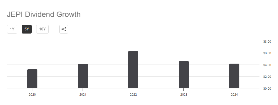 - 배당성장: JEPI는 배당금이 매년 변동을 보이고 있습니다. 2022년엔 배당금이 전년 대비 무려 50% 이상 늘어나기도 했다가 2023년에는 다시 -27%가량 줄어들기도 했습니다.