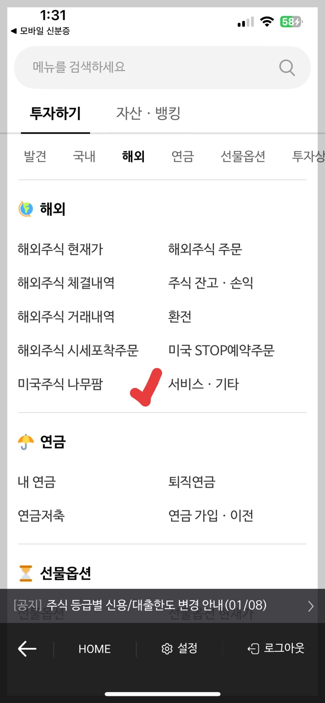 「해외주식 → 서비스·기타」 항목을 선택합니다.
