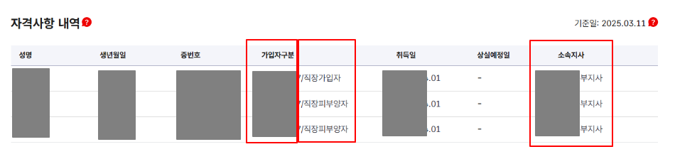 의료보험 종류: 두 번째 빨간 네모 (직장가입자 등 써있는 내용 작성)