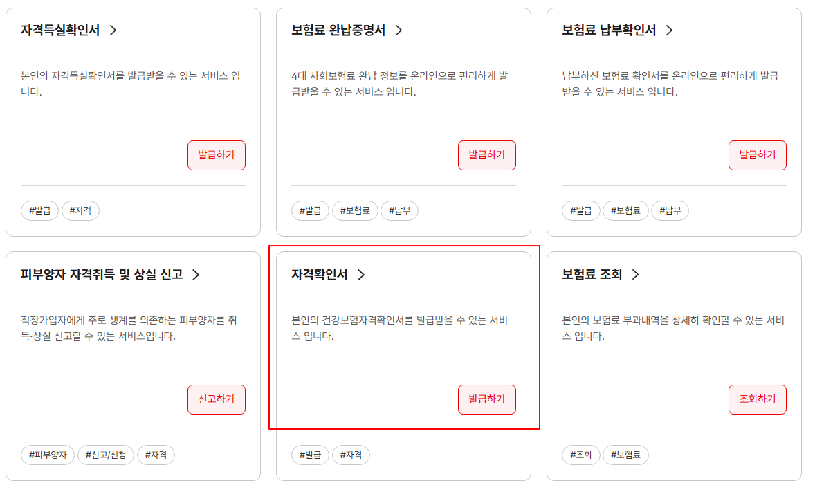 '자격확인서'를 찾아 '발급하기' 버튼을 클릭해줍니다.