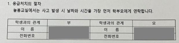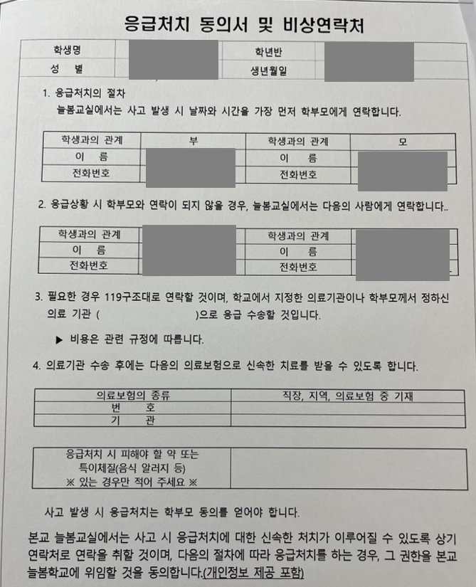 아이가 학교에서 늘봄 수업을 하게 되었는데, 제출해야 하는 서류 중 '응급처치동의서'가 있었습니다.