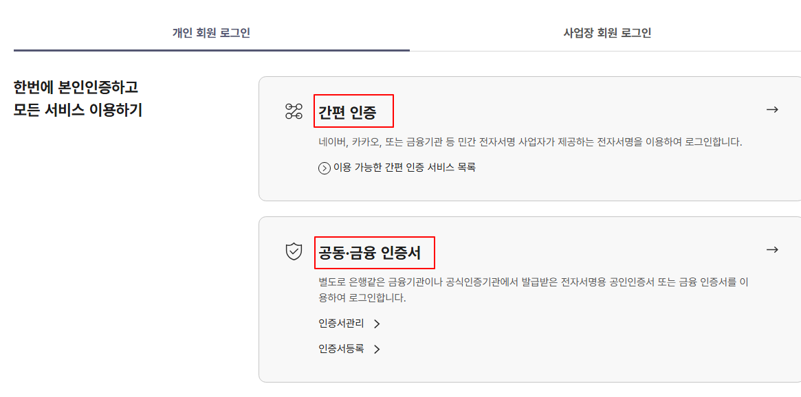 2) 로그인은 간편인증(네이버, 카카오 등) 또는 공동/금융 인증서 로그인 모두 가능합니다.