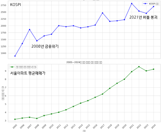위 그래프는 2005년부터 2024년까지 과거 20년 동안의 KOSPI 연평균 지수와 서울 아파트 평균 매매가의 변화를 나타낸 그래프입니다. 이 데이터를 바탕으로 두 자산은 상당히 큰 상관관계를 가지고 있는 것을 볼 수 있습니다. 코스피지수가 오르면 서울 아파트 가격도 함께 오른 것으로 확인됩니다.