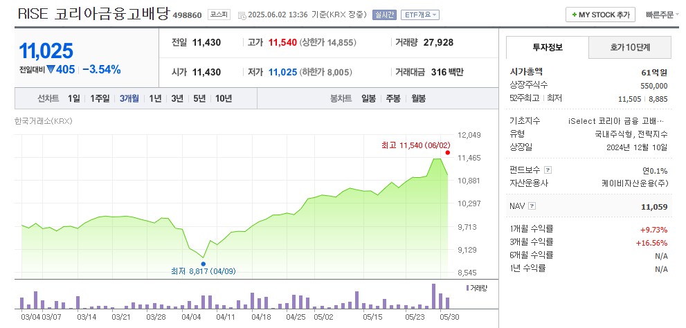 위 3개 ETF는 구성하는 종목은 비슷하지만 종목별 비율에 있어 차이가 있습니다. 장단점이 있겠지만 개인적으로는 최근 상장된 RISE 코리아금융고배당 ETF가 좋아보입니다. 구성 종목에 있어 다양한 증권사 종목에 비교적 균등한 비율로 분포가 되어 있고, 수수료가 저렴합니다. 그리고 무엇보다 배당 주기가 다른 종목의 경우는 연 1회 배당을 지급하고 있는데, RISE 코리아금융고배당 ETF의 경우는 매월 분배금을 지급한다는 점에서 보다 안정적인 현금 흐름이 가능해 보입니다.