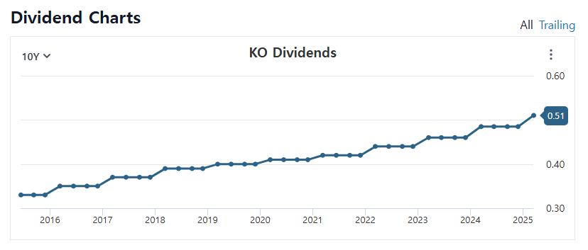 코카콜라는 꾸준히 배당을 늘려온 기업으로, 연속적으로 배당금을 늘려오고 있습니다. 무려 지난 64년 동안 예외 없이 매년 배당금을 인상해 왔는데요, 그렇다보니 주가 상승과 안정적인 현금 흐름을 동시에 얻을 수 있어서 투자자들에게 신뢰를 받고 있습니다.