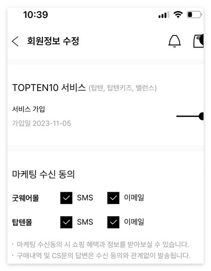 만약 위 1~3번까지 하고도 계속해서 쿠폰 다운로드가 안된다면 마케팅 수신 동의 부분을 다시 확인해 보아야 합니다. 쿠폰 다운로드 시 '마케팅 수신 동의하기'를 클릭했어도 수신 동의 처리가 되어 있지 않는 경우가 있습니다.