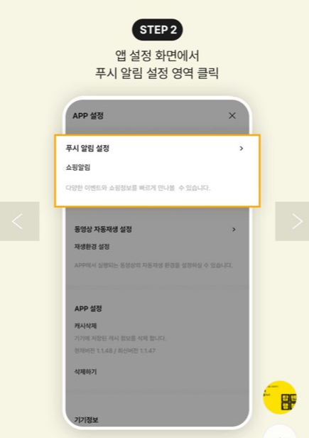 2. 앱 설정 화면에서 푸시 알림 설정 영역 클릭