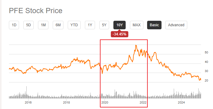 화이자는 2020년~2021년 코로나19 백신과 치료제 개발로 급격하게 실적이 성장하면서 $35 내외이던 주가는 $50 이상까지 상승했습니다. 그러나 이후 백신 수요가 감소하면서 매출과 이익이 급감했고, 주가는 지속적인 하락세를 보이고 있습니다.