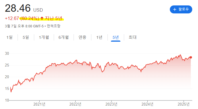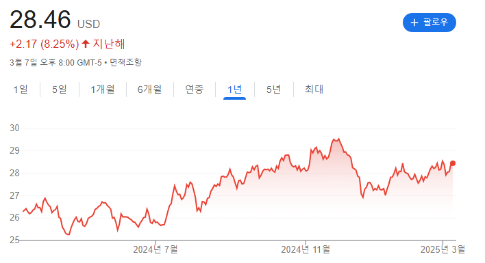 SCHD의 현재 주가는 $28.46으로 거래되고 있습니다.